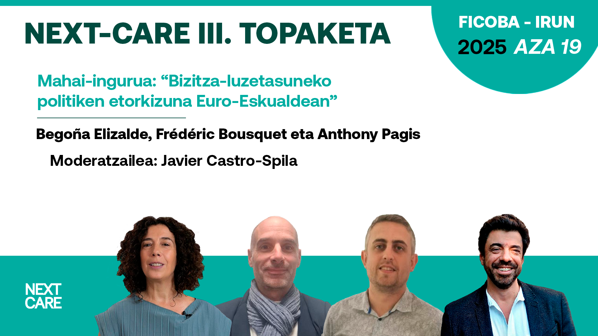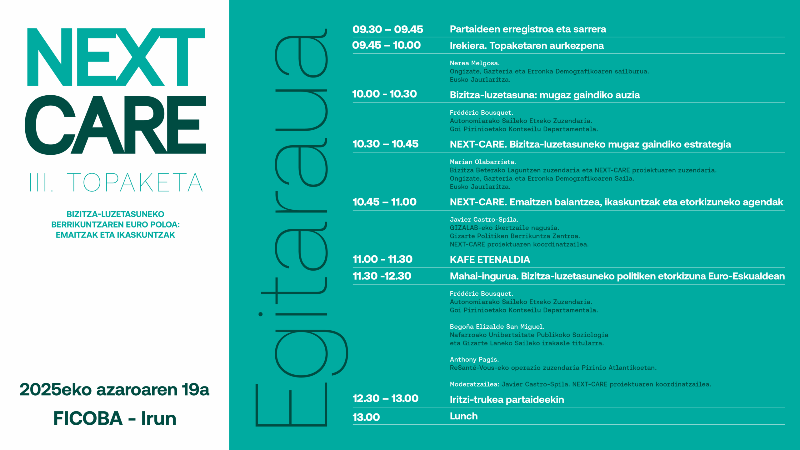 Ondoren, Marian Olabarrieta, Eusko Jaurlaritzako Bizitza Beterako Laguntzen zuzendaria eta NEXT-CARE proiektuko zuzendaria, mugarteko longetibitate estrategia aurkeztuko du, lankidetza instituzional eta sozialaren garrantzia azpimarratuz, eredu berritzaileago eta jasangarriago baterantz aurrera egiteko. Bestalde, Javier Castro-Spila, GIZALAB-eko ikertzaile nagusia eta NEXT-CARE proiektuaren koordinatzaileak, emaitza eta ikaskuntzen balantzea eskainiko du, eta azken urteetako lanetik sortzen diren etorkizuneko agendak proposatuko ditu.