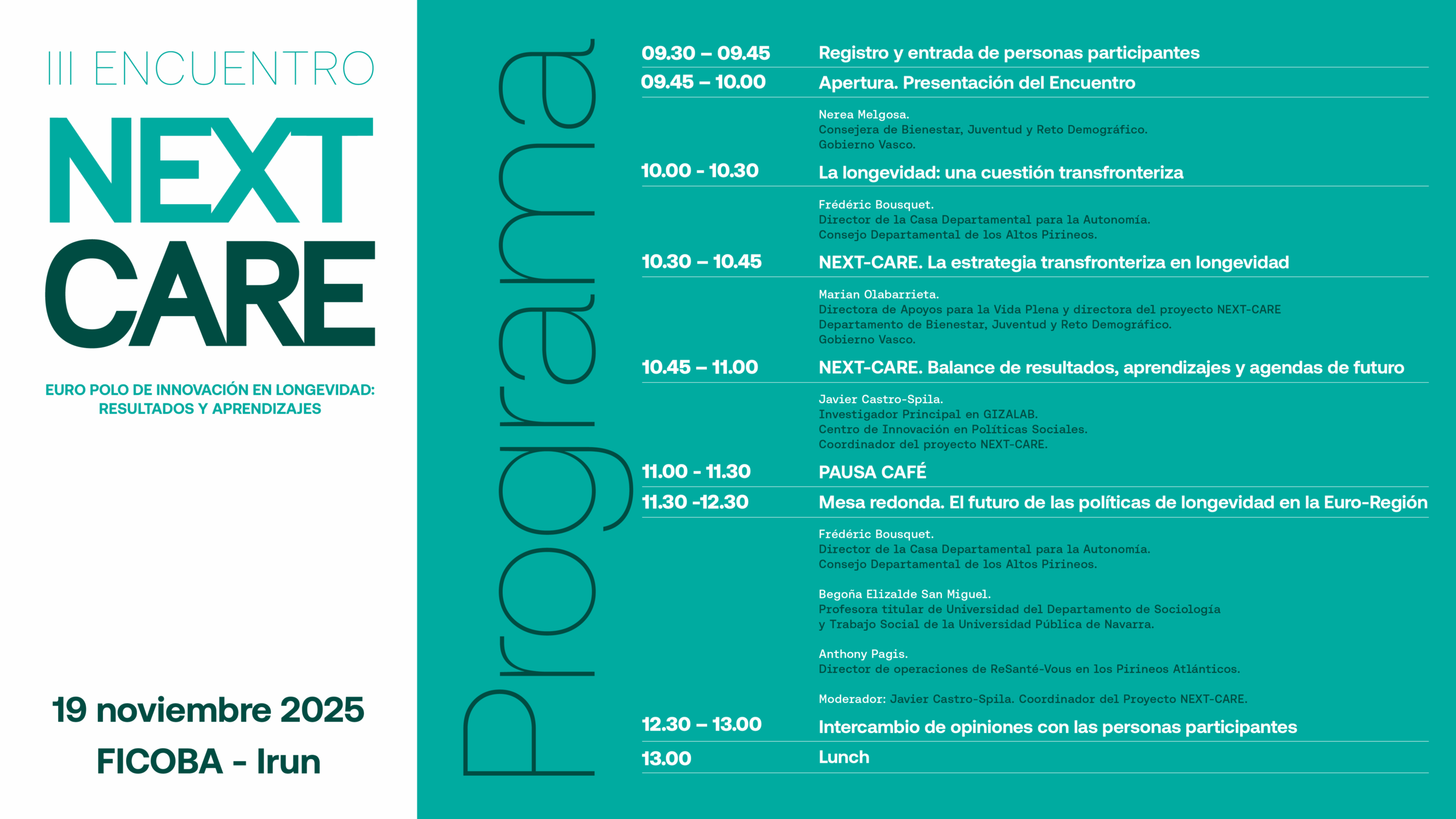 El III Encuentro NEXT-CARE. Resultados y aprendizajes, se celebrará el 19 de noviembre de 2025, entre las 09:30 y las 13:00 horas, en las instalaciones de Ficoba, Irun.